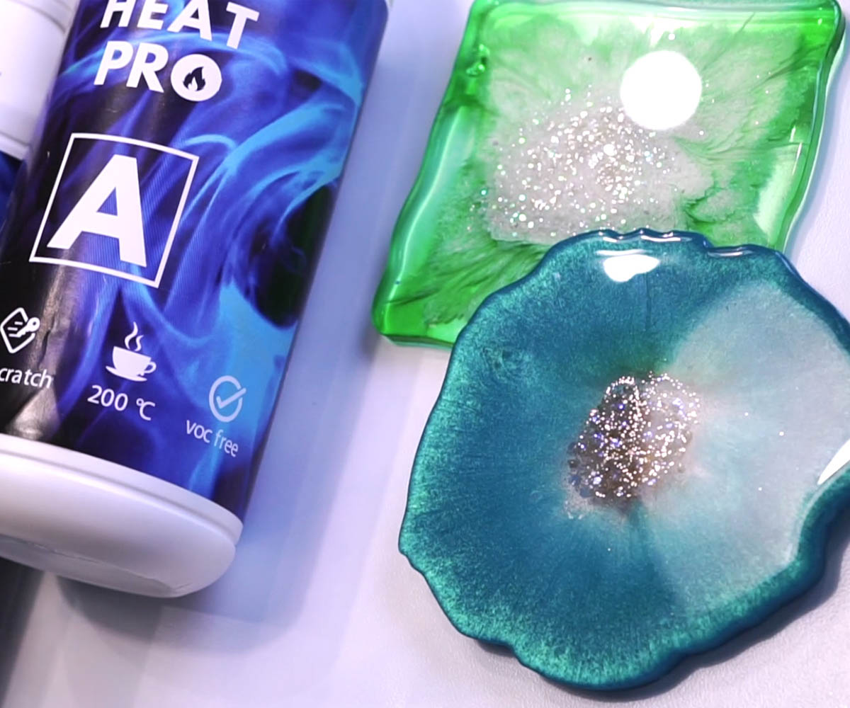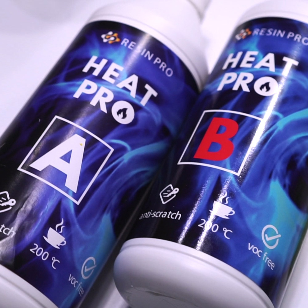 Revêtement protecteur anti-rayures HEAT PRO - Résiste jusqu'à 200°C Vous cherchez un produit qui protège vos créations et surfaces en résine ? Vous avez peur des rayures et de l'usure de vos tables, plateaux et dessous de verres en résine ? HEAT PRO est une résine polyuréthane transparente à deux composants, idéale pour protéger vos créations. Sa formulation élastique spéciale lui permet d'absorber les chocs et les rayures, en restant toujours poli miroir ! Il résiste également jusqu'à 200°C et est idéal pour les surfaces qui entreront en contact avec des pots ou d'autres matériaux à haute température.