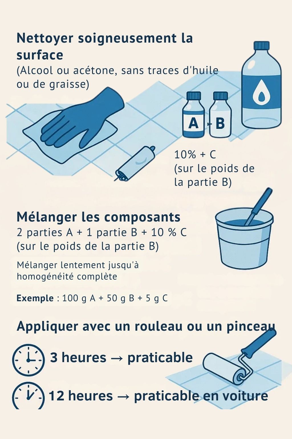 - Ratio de mélange : A:B = 2:1 (+ C = 10 % de B)