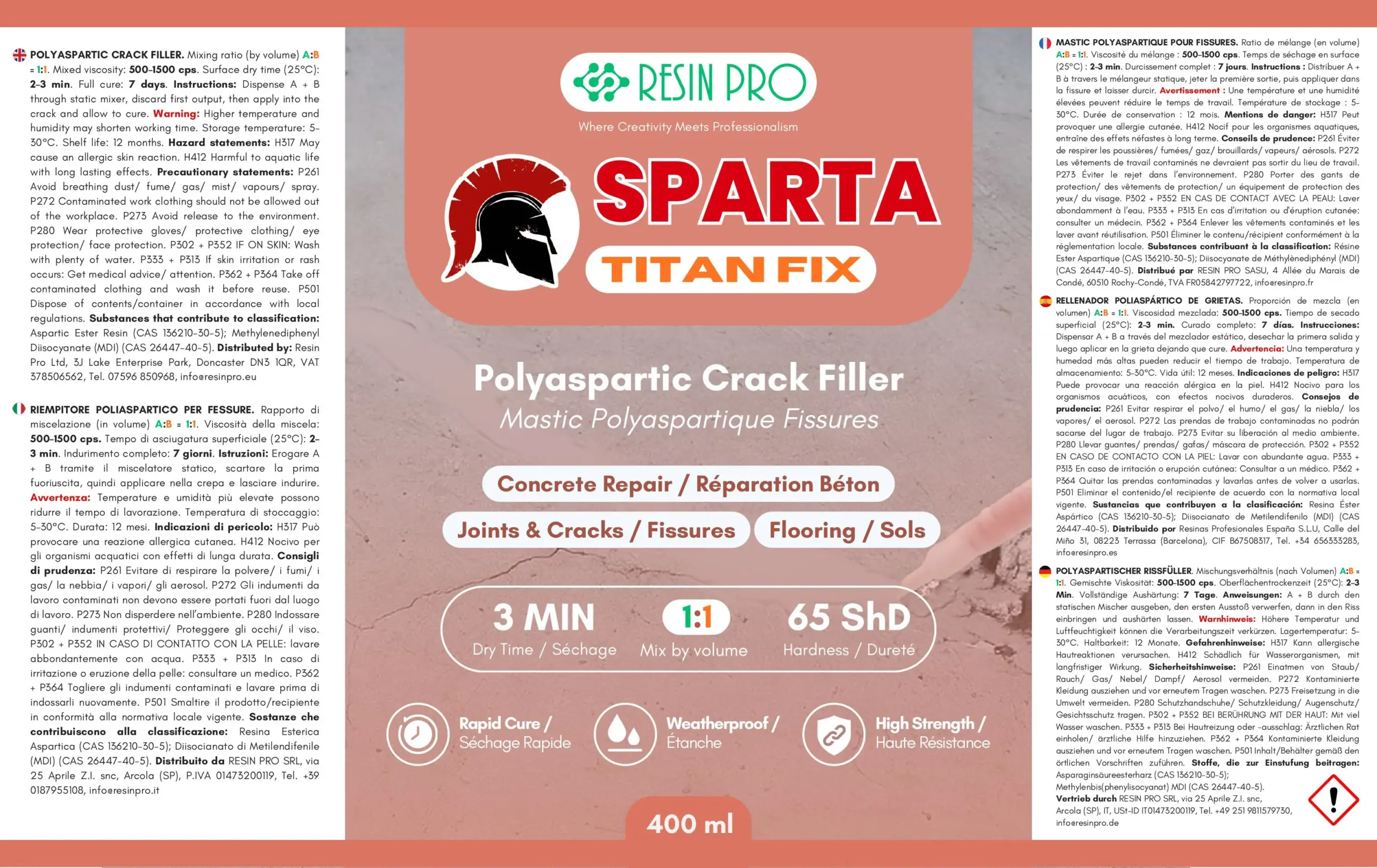 Ligne SPARTA by ResinPro La résine polyaspartique N°1 en Europe La solution professionnelle pour des réparations durables et rapides TITANFIX est un mastic polyaspartique bicomposant de nouvelle génération, spécialement conçu pour la réparation efficace et durable des fissures du béton. Issu de la ligne professionnelle SPARTA de ResinPro, il offre une combinaison idéale de rapidité de durcissement, haute résistance mécanique et adhérence exceptionnelle, même dans des conditions exigeantes. Conditionné en cartouche prête à l’emploi et appliqué au pistolet, TITANFIX garantit une mise en œuvre simple, précise et fiable sur chantier.